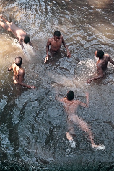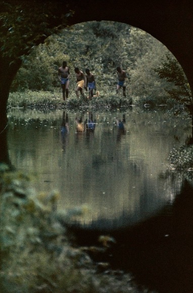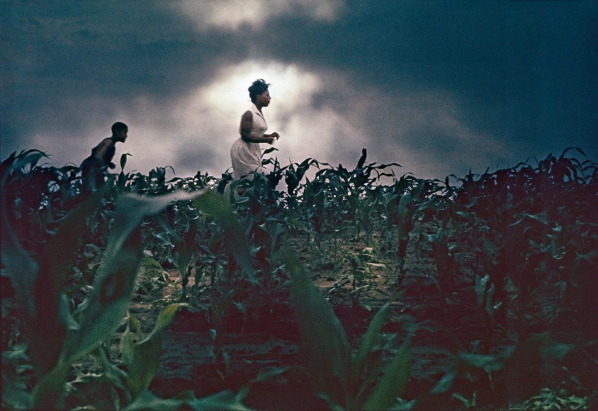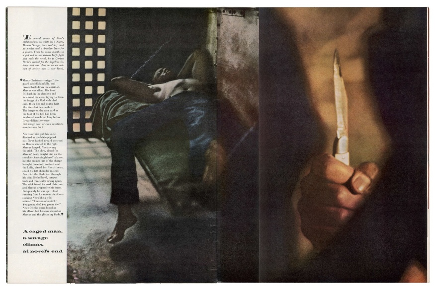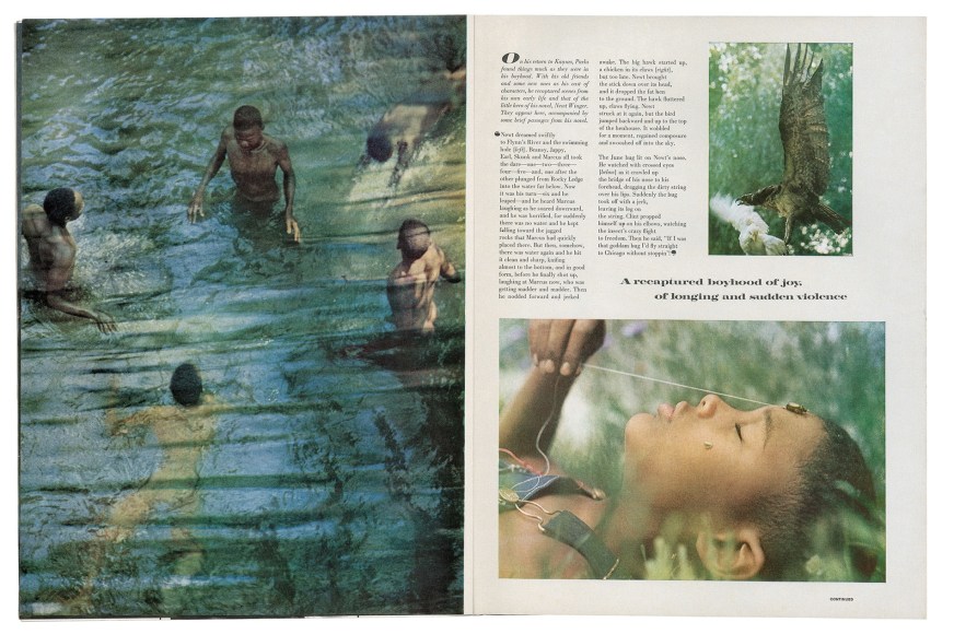 To make visible and symbolic the book’s narrative arc, the year of the book’s publication Parks created a series of color photographs. They are remarkable for the simultaneously idyllic and threatening tone and compositions—echoing the novel’s own conflicted and wrenching narrative. A selection of these images appeared in the August 16, 1963 issue of Life magazine, under the title “How It Feels To Be Black,” accompanied by passages from the book. Among the images is one of a boy laying peacefully in a field, his eyes closed as he pulls on string tied to a June bug crawling his way up his forehead. Parks lowered his camera to ground level, lying beside him in the field to capture the moment before the June bug’s escape to freedom, as described in its accompanying passage: