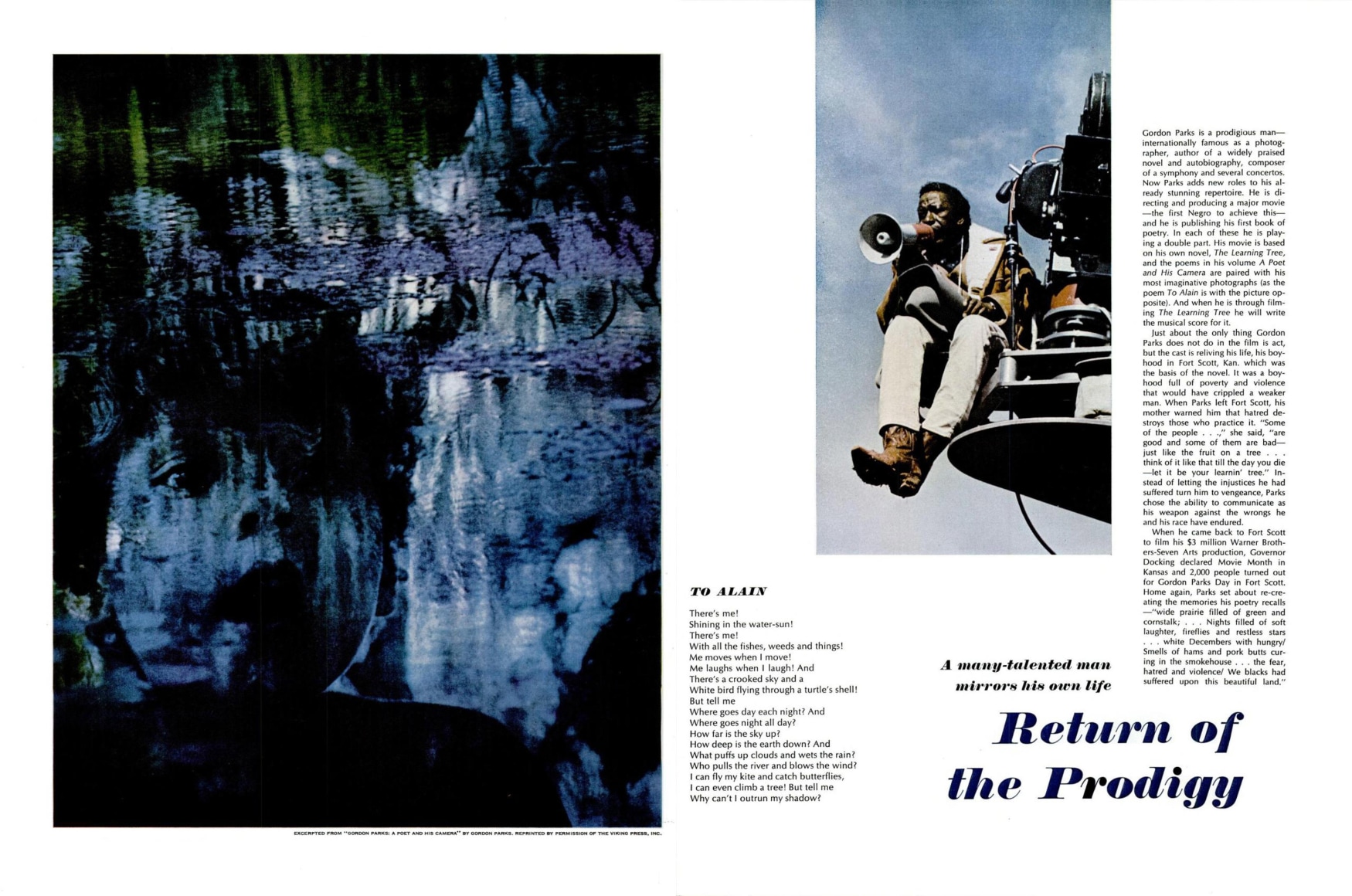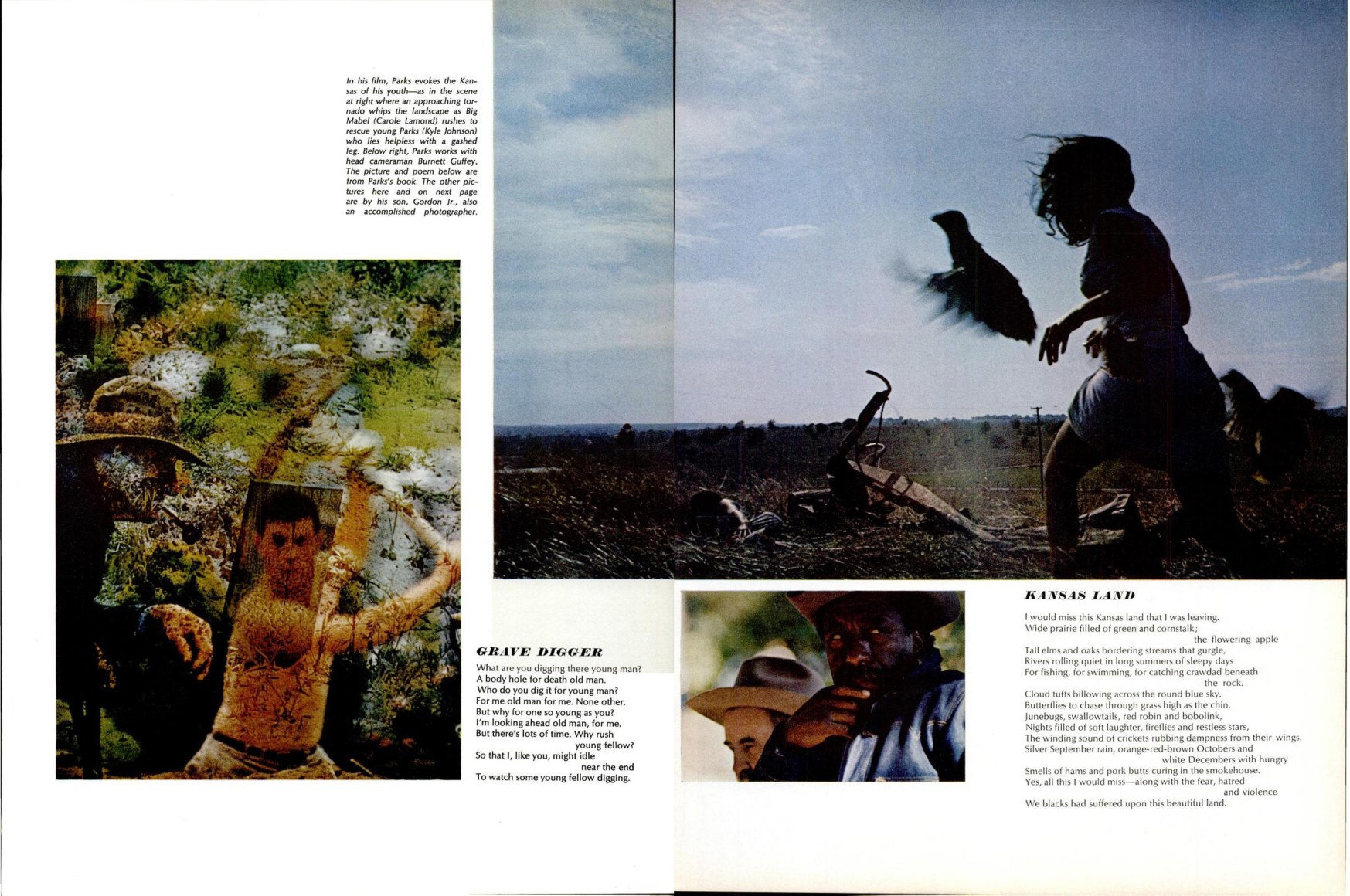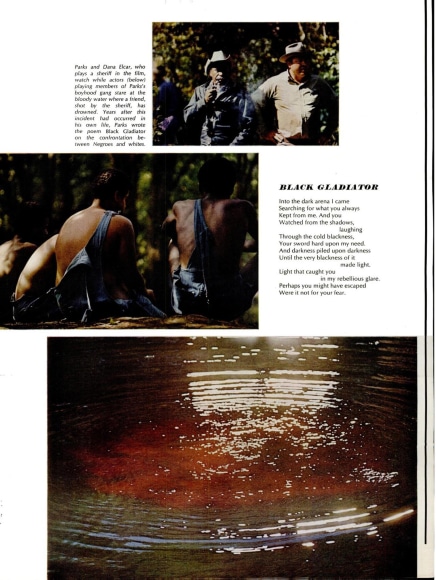 In November 1968, just a few months before The Learning Tree was released in cinemas, an article in Life magazine celebrated the “return of the prodigy” via the forthcoming film and the publication of A Poet and His Camera, a book of poetry paired with photographs. The article elaborates: “internationally famous as a photographer, author of a widely praised novel and autobiography, composer of a symphony and several concertos. Now Parks adds new roles to his already stunning repertoire.” Indeed, by that point Parks had proven his mastery of several creative weapons—photographs, films, words, and music. With all of these, he sought to advance what he described as "the common search for a better life and a better world,” as he beautifully described in his poem “Kansas Land,” included in the article: