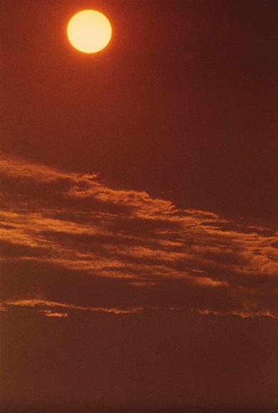 Cloud tufts billowing across the round blue sky.