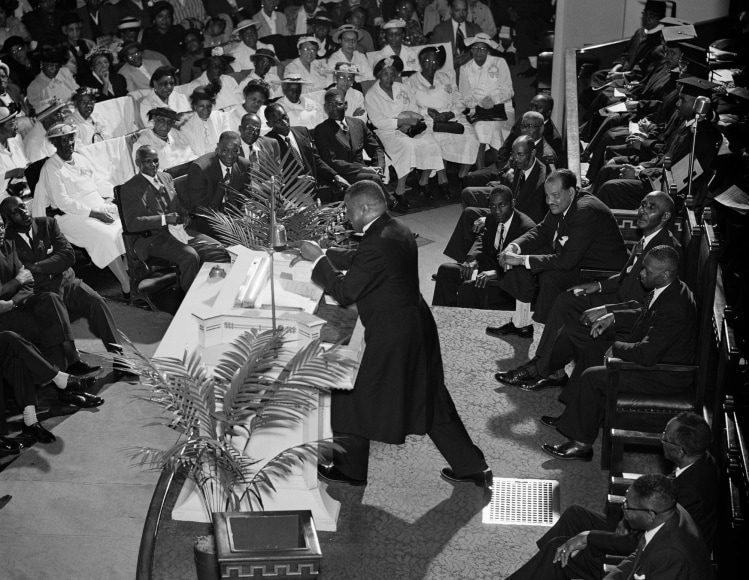 Pastor Ledbetter earned a reputation for his compassion­ate, unwavering service to the West Side through civic en­gagement and advocacy. In 1949, he led fund-raising campaigns for Chicago’s West Side branch of the National Urban League. Parks’s photographs reflect a period of in­creased visibility for Ledbetter in the 1950s: there was media coverage of his activity with the National Association for the Advancement of Colored People (NAACP), his leadership in the National Baptist Convention of America, and his public appearances at school dedication ceremonies and other local events. Throughout the 1950s and 1960s, Reverend Ledbetter was also an advocate for gender equality among Baptist clergy. In 1965 he made history when he ordained Trudie Trimm, the first Baptist woman to be consecrated as clergy and appointed church pastor in the National Baptist Con­vention, USA. Ledbetter stood apart from the majority of Baptist ministers by publicly supporting “equal opportunity of the sexes to preach the Gospel.”
