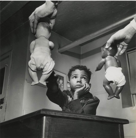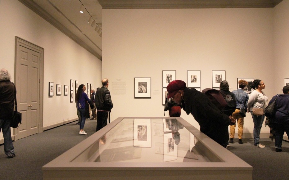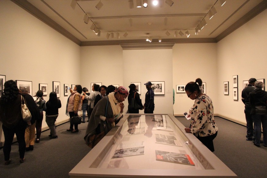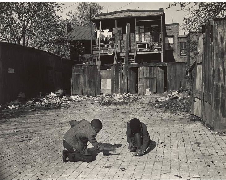 Gordon Parks: The New Tide is divided into five sections. The first, A Choice of Weapons (1940–1942), opens with some of the elegant society portraits that established Parks’s career as a professional photographer in Saint Paul and Minneapolis. After moving with his wife and two children to Chicago in early 1941, Parks was given access to studio space and a darkroom in the South Side Community Art Center (SSCAC). Recently established with support from the Works Progress Administration’s Federal Art Project, the SSCAC was the epicenter of Chicago’s African American art scene. In addition to earning a decent living by taking portraits of the city’s middle- and upper-class African American community, Parks documented SSCAC activities, including its May 1941 dedication with First Lady Eleanor Roosevelt in attendance. He developed relationships with other artists—many who taught at the center—such as Eldzier Cortor, Margaret Taylor Burroughs, and Charles White. The latter, a painter, encouraged Parks to take his camera onto the streets to document the surrounding South Side neighborhood. This section also includes Parks’s portraits of influential figures, such as SSCAC director Peter Pollack, renowned poet and playwright Langston Hughes, philosophy professor and architect of the New Negro movement Alain Locke, and opera singer Todd Duncan.