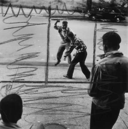 An intent young man holds a brick, waiting for something to happen. Kids play in the spray of a fire hydrant. Two young men fight, fists in the air, while others look on. These images of Harlem in 1948 were the result of African-American photographer Gordon Parks entering the inner circle of a teenaged gang leader, Leonard “Red” Jackson. Parks spent a month with Jackson, accompanying him to fights, diplomatic sessions with other gangs, quiet moments at home, and even the wake of another gang member. The outcome was a photo essay, “Harlem Gang Leader,” published in Life that same year, which helped to establish Parks as one of America’s most significant social photographers of the 20th century.