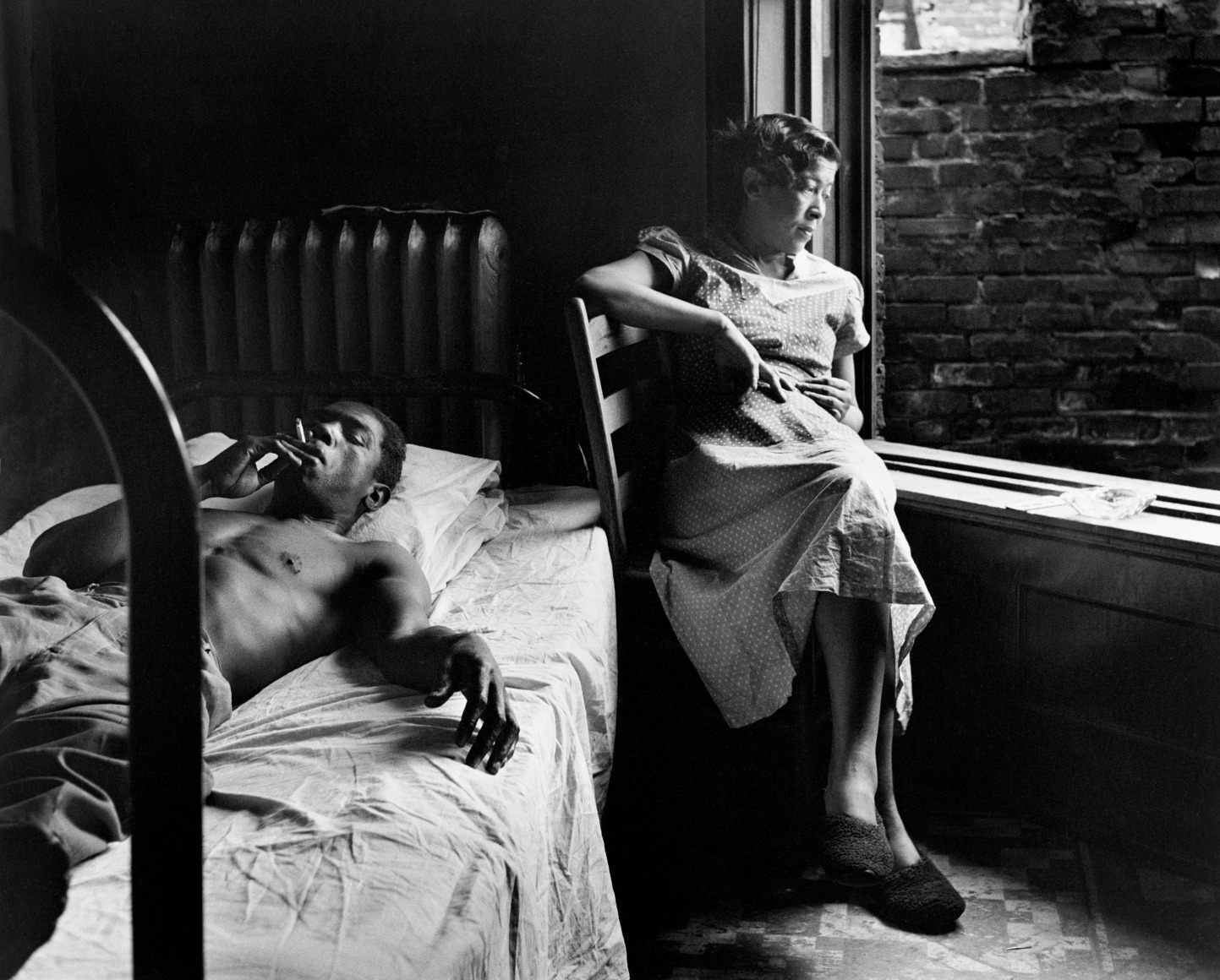 A year after Life hired him, the magazine sent Parks back to Fort Scott, Kansas, where he had spent his first 16 years, attending the town’s small segregated schools. His assignment was to find the 11 members of his junior high school graduation class and discover what had become of them in the more than 20 years that had elapsed since his departure. While Parks found the town itself little changed, his classmates had followed diverse paths. Some had remained in Fort Scott; some had moved away, to Cleveland, Detroit, St. Louis; and some were married—even to each other. Parks regarded most of these reunions with a joyful, nostalgic eye, but encountering Mazel Morgan cast the project in darker terms. She had moved to Chicago, where Parks found her nursing wounds freshly delivered by her drug dealer.