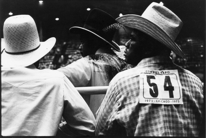 The Defender ran a story about the Garage. In 1975, also as a part of the series for the newspaper, I photographed a rodeo that came to Chicago. There were Black cowboys there—Bill Pickett may have been there too. I've always been fascinated with wanting to understand what made African Americans choose that part of the culture. I became aware of the Bill Pickett rodeo circuit after that, and I started photographing those events in places like Boley, Oklahoma. Every place I traveled, I photographed the Black cowboys. Ted Williams helped me name the series the Dark Riders.