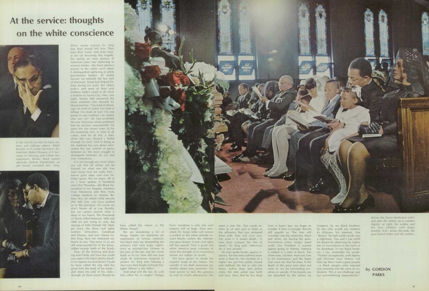 White racists warned Dr. King that they would kill him. They kept their word. And even now, as we sat mourning this tragedy, the spring air over dozens of American cities was darkening to arsonist smoke— the black ghetto's answer to the white racist deed. A distinguished gathering of white government leaders, all visibly moved, sat beneath the hot roof of Ebenezer. Some had helped Dr. King during his trials. But others hadn't, and most of their soul brothers hadn't cared at all. Over a bonfire in Yazoo City, Miss, one night, Martin had answered the black extremist who shouted for blood and fire: " I'm tired of shooting! I'm tired of clubs! I'm tired of killing! I'm tired of war! I'm not going to use violence, no matter who says so!" He had protested the way American whites preferred that he protest—nonviolently. He spent the last dozen years of his life preaching love to men of all colors. And for all this, a man, white like you, blasted a bullet through his neck. And in doing so the madman has just about eliminated the last symbol of peace between us. We must struggle to distinguish between his act and your conscience.