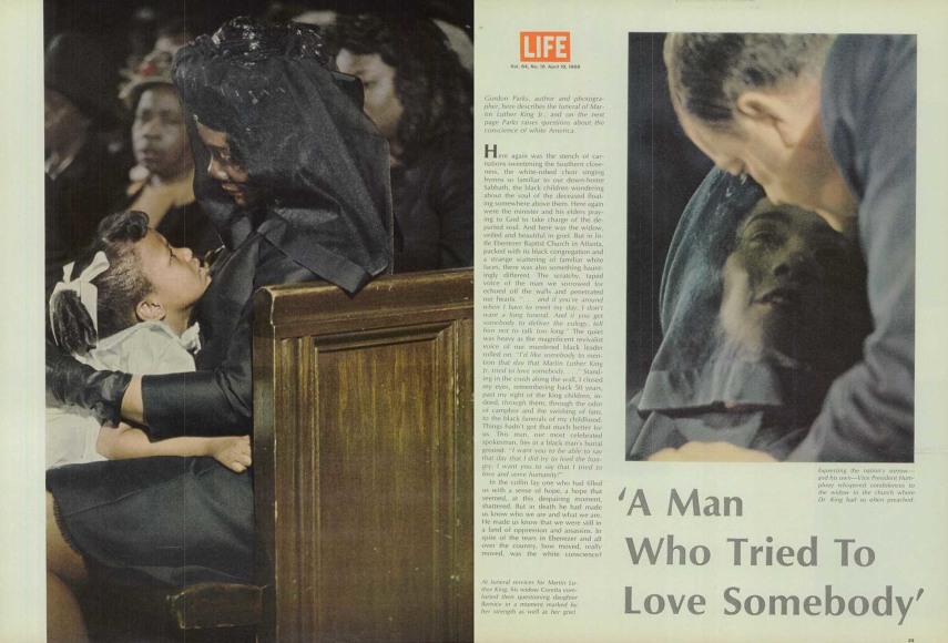 On April 4, 1968, Martin Luther King, Jr. was assassinated in Memphis Tennessee. Just over two weeks later, Life magazine sent Gordon Parks to Atlanta, Georgia to cover Dr. King's funeral as a journalist, not a photographer. The essay chronicled the event, but also conveyed a searing reflection on the conscience of white America—one that was met with apprehension by Life’s editors. The accompanying photographs of the funeral were not taken by Gordon Parks, but by Black Star photographers Bob Black, Bob Fitch, and Flip Schulke. The essay’s title, “The Man Who Tried to Love Somebody,” was borrowed from a sermon titled “The Drum Major Instinct,” delivered by Dr. King at Ebenezer Baptist Church on February 4, 1968, just two months before his assasination. In that speech, he told the congregation what he would like said at his funeral: “I’d like for somebody to say that day that Martin Luther King, Jr., tried to love somebody.”