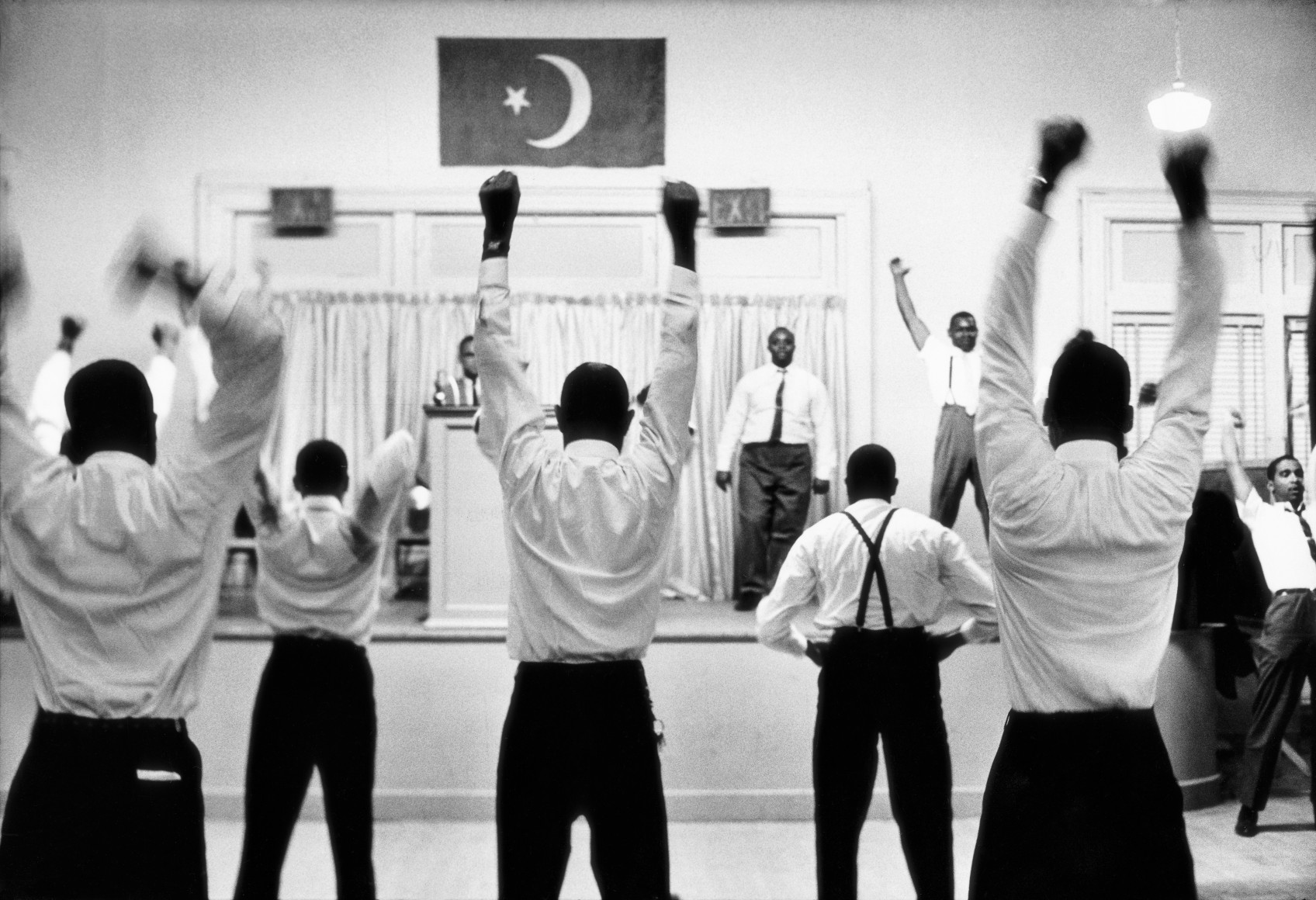 The Nation of Islam was a political and religious movement founded in 1930 by Wallace D. Fard Muhammad. Initially based in Detroit, Michigan, the group promoted the teachings of the Quran, and advanced notions of Black Nationalism. By the 1950s, the Nation of Islam’s message of racial independence resonated with many African Americans, leading to the rapid growth of this radical civil rights movement. With the help of his friend Malcolm X, Parks was able to arrange a meeting with Elijah Muhammad, the Nation of Islam’s leader, to obtain permission to proceed with the story. Parks spent weeks with the black Muslim community in Chicago, Los Angeles, and New York documenting a range of its activities—from self-defense training to religious services led by Malcolm X. The resulting photographs, while highly choreographed by members of the Nation of Islam, nevertheless provided a complex view into this community—one that was unquestionably political and yet deeply empathetic.