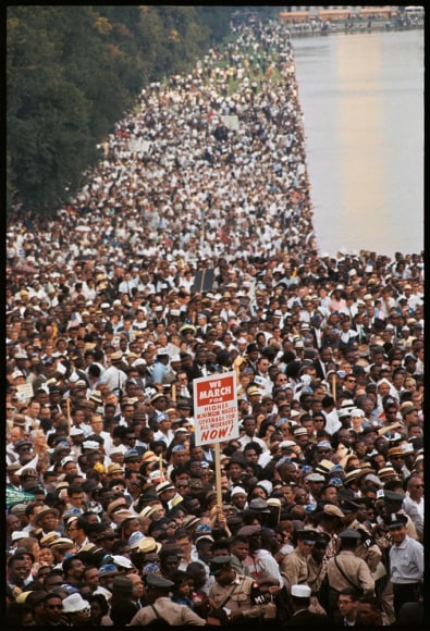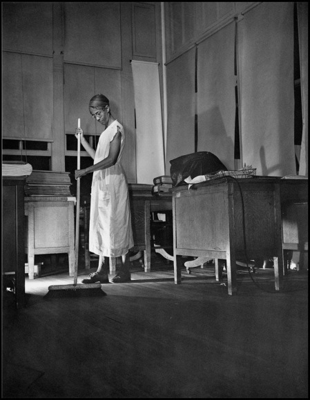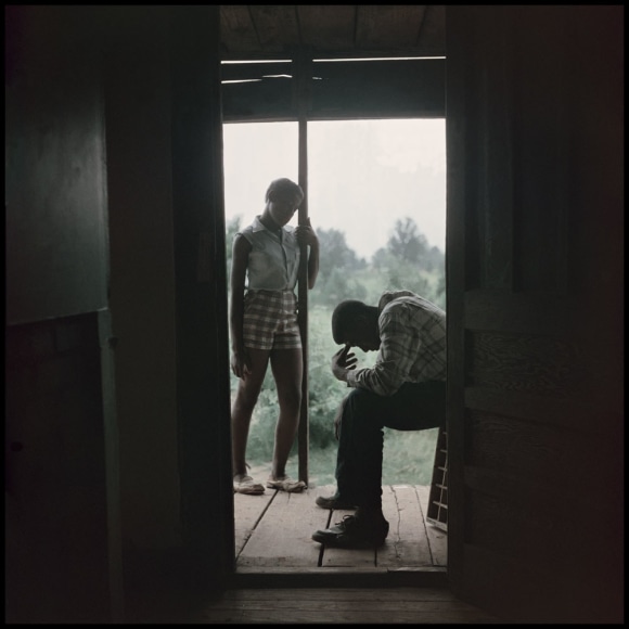 During the late 1940s through the 1960s, Parks produced some of his most renowned photographic essays on issues relating to civil rights. A stoic portrait of Red Jackson, from a 1948 series on the Harlem gang leader, reveals a man seemingly hemmed in by his options as he stares intently out a broken window; the darkness of the interior contrasts forebodingly with the light illuminating him from the street.
