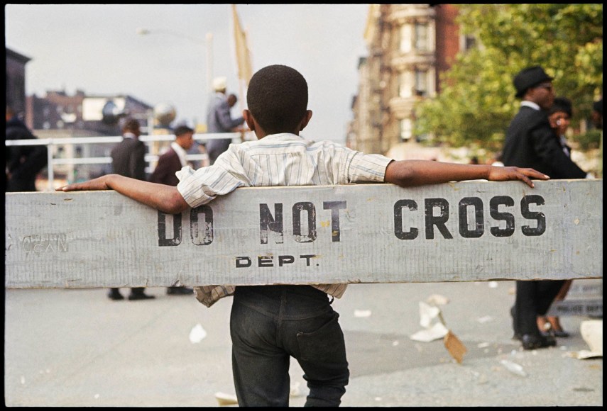 Children were a subject Parks captured throughout his career. Photographing them allowed Parks to expose contemporary issues of racial, social, and economic inequality, while also often presenting the possibility of a hopeful future. Included in the exhibition is the iconic image Doll Test, Harlem, New York (1947), which documents the infamous psychological experiment that tested the effects of segregation on Black children, as well as selections from Parks’ 1956 Life Magazine photo essay “A Segregation Story.” Meanwhile, in the more ambiguous Untitled, Harlem, New York (1963), a young boy stands astride a police barrier—the setting left undetermined to the viewer—exuding a casual self-possession that can only come with youth.