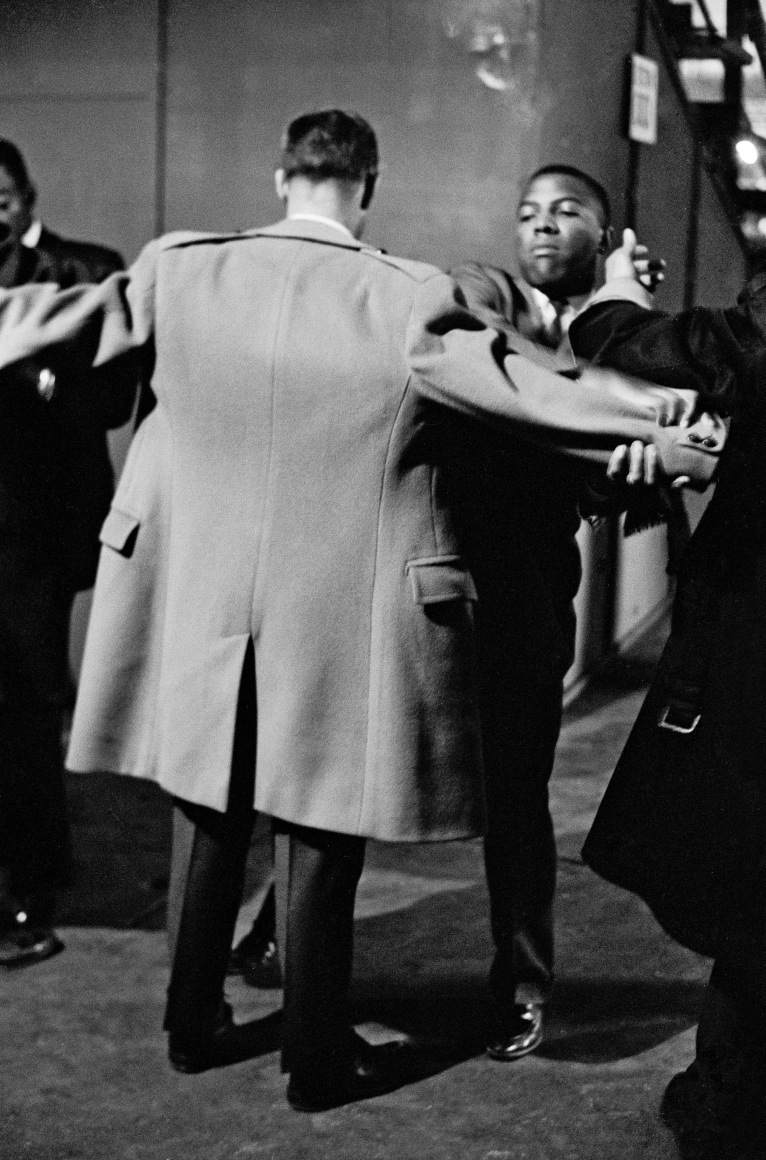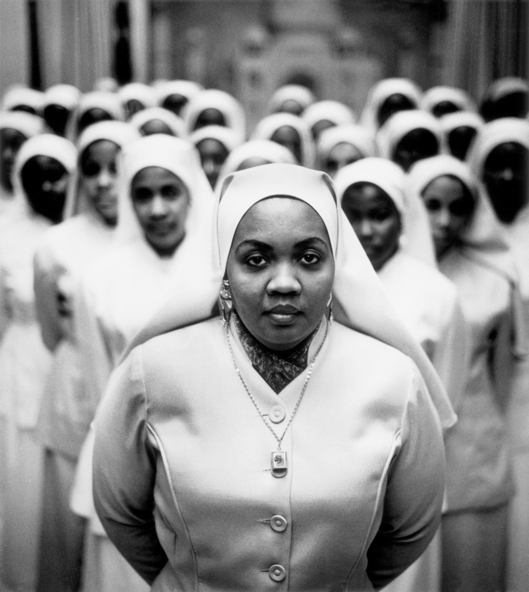 Muhammad ultimately agreed to the article, which became one of Parks’s groundbreaking pieces. He documented virtually every aspect of the Black Muslim community, in a full spectrum of images ranging from children and families at prayer to grown men exercising their physical strength in self-defense drills. In addition to piercing portraits of Malcolm X and Elijah Muhammad, the story featured one of Parks’s masterpieces: a photograph of Muslim Sister Ethel Sharrieff in Chicago. She stares resolutely, with an almost disconcerting calm, into the camera as her sisters in a V-shaped column fall out of focus behind her. Especially impressive is the contrast between their dark skin and their white clothing and veils.