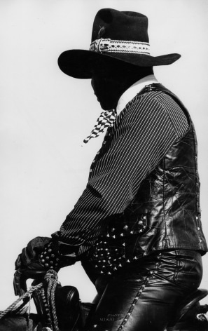 The Defender ran a story about the Garage. In 1975, also as a part of the series for the newspaper, I photographed a rodeo that came to Chicago. There were Black cowboys there—Bill Pickett may have been there too. I've always been fascinated with wanting to understand what made African Americans choose that part of the culture. I became aware of the Bill Pickett rodeo circuit after that, and I started photographing those events in places like Boley, Oklahoma. Every place I traveled, I photographed the Black cowboys. Ted Williams helped me name the series the Dark Riders.