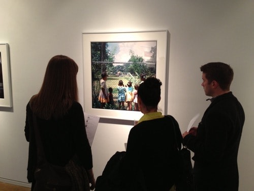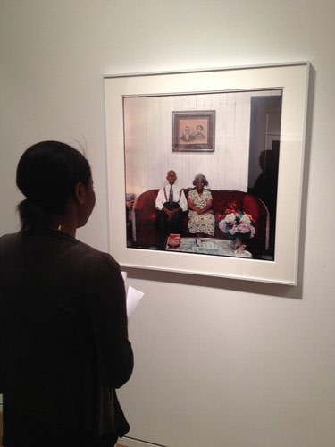 Parks’s versatility is in evidence in this selection: many of his most celebrated images convey the action of significant moments, particularly, American Gothic. After experiencing racism in Washington, DC, Parks created this iconic photograph of Ella Watson, a black charwoman holding a broom and mop, standing in front of an American flag, an overt reference to the 1930 painting, American Gothic by Grant Wood. Also included is a poignant portrait of Harlem gang leader Red Jackson gazing out of a window, part of a photo essay which Parks completed for Life in 1948, under the headline, “Harlem Gang Leader: Red Jackson’s Life is One of Fear, Frustration and Violence.” There are portraits of more notable and familiar individuals such as Muhammad Ali training with his hands bound, and Malcolm X addressing a rally in Chicago in 1963. In these candid photographs, Parks has the gift of isolating the moment and making it speak for a sea-change in history. But his posed photographs likewise express action and vitality: in one image, a model in an evening gown is flanked by four tuxedoed suitors, with New York’s Times Square looming behind them. The image is all motion—the model is captured bending backwards to one of the gentlemen, another man is a blur, save for a smiling face. The photograph conveys the kinetic energy of the city, the joy of being young, affluent, and out for a good time. In another image, also taken in 1956, another well-dressed young woman stands in the street, this time accompanied by a little girl. They too, show signs of postwar prosperity and possibility. But they are African American, and they stand under a neon sign indicating a “Colored Entrance”—that possibility is curtailed and restricted by the reality of racial segregation. Parks’s photographs capture specific moments in the American past, while at the same time evoking universal emotions.