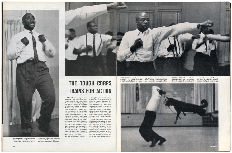 Muhammad ultimately agreed to the article, which became one of Parks’s groundbreaking pieces. He documented virtually every aspect of the Black Muslim community, in a full spectrum of images ranging from children and families at prayer to grown men exercising their physical strength in self-defense drills. In addition to piercing portraits of Malcolm X and Elijah Muhammad, the story featured one of Parks’s masterpieces: a photograph of Muslim Sister Ethel Sharrieff in Chicago. She stares resolutely, with an almost disconcerting calm, into the camera as her sisters in a V-shaped column fall out of focus behind her. Especially impressive is the contrast between their dark skin and their white clothing and veils.
