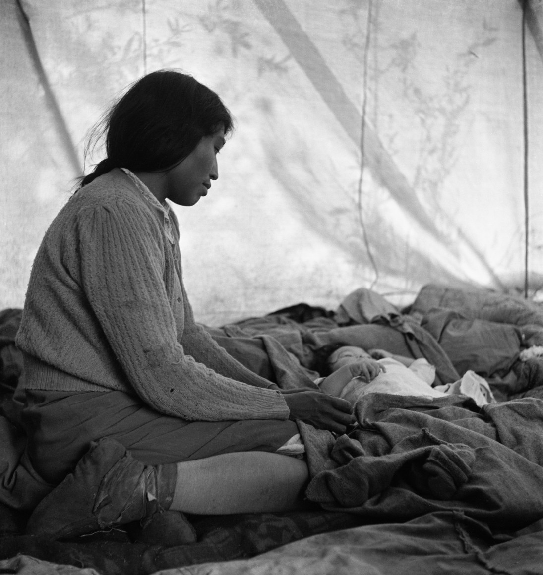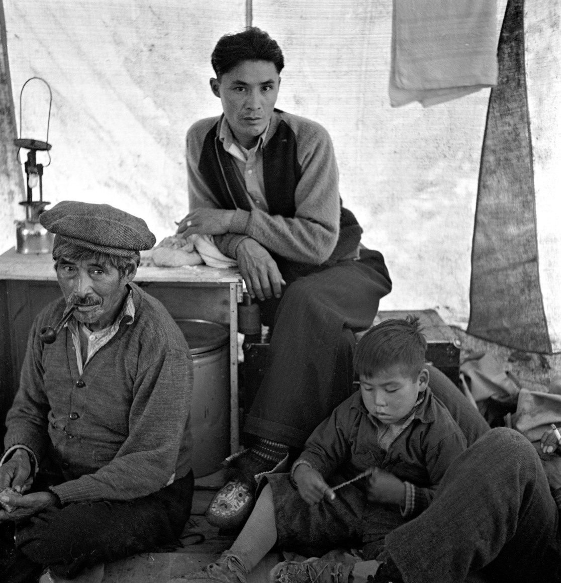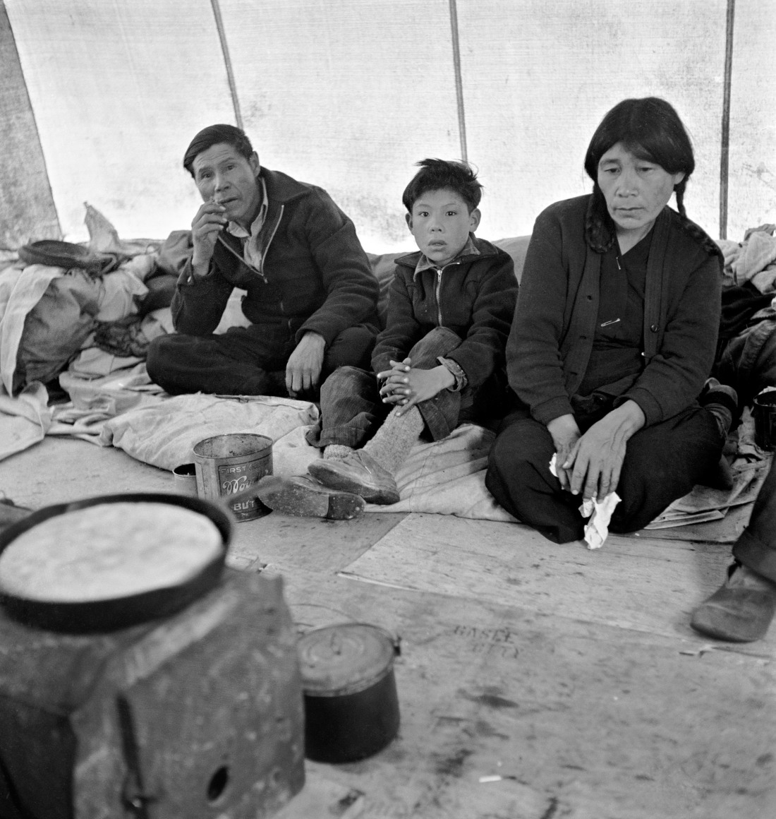In the autumn of 1945, Standard Oil sent Parks to Yellowknife, a mining town in Canada’s Northwest Territories that had undergone a significant population surge since the beginning of World War II. The assignment seemed straightforward: Parks was to make a pictorial record of the production and consumption of petroleum in Yellowknife over the course of several months. But when his plane from Ontario arrived on the frozen airfield, the situation quickly changed. Parks was greeted by a snowstorm, the local Standard Oil representative, and a slender native man named Jocko who was to serve as guide. After showing Parks the lay of the land, Jocko invited him to the Indian reservation to meet his tribe, part of the Dene people. Parks was the first Black man the natives had seen, and they were interested in why white men treated him with such honor and respect. For his part, Parks saw parallels between his experience of discrimination in the United States and the conditions these native people faced in Canada. He also recognized that they needed help. The questions they asked were difficult: How could they get white men to offer the better work? Better schools and education, Parks told them. How could their sick obtain the medical attention they so badly needed? Knowing that the only solution was immediate access to a hospital, Parks returned to his hotel and called his program director. Parks and Stryker arranged for $3,000 to be wired to Yellowknife, thus allowing some of the sick children to go to a clinic in Ottawa. Hoping to assist the people further, Parks arranged for Standard Oil to send $10,000 to fi nance proper schooling for the brightest local children. To show their appreciation for his kindness and generosity, the tribe sent Parks ten feathers from the headdress of the chief and named a lake in his honor.